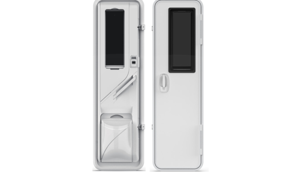 Puerta probada según normas, aprobada para autocaravanas. Marco y hoja de la puerta de aluminio, radios de las esquinas de 89 mm, para espesores de pared de 31-33 mm Y MEDIDAS1950x550 2x, bisagra de la puerta vista desde el exterior a la derecha. Ventana integrada E1. Cilindro de bloqueo HSC-II. Carcasa interior de ABS. Se puede conectar al cierre centralizado del vehiculo y a la alarma.